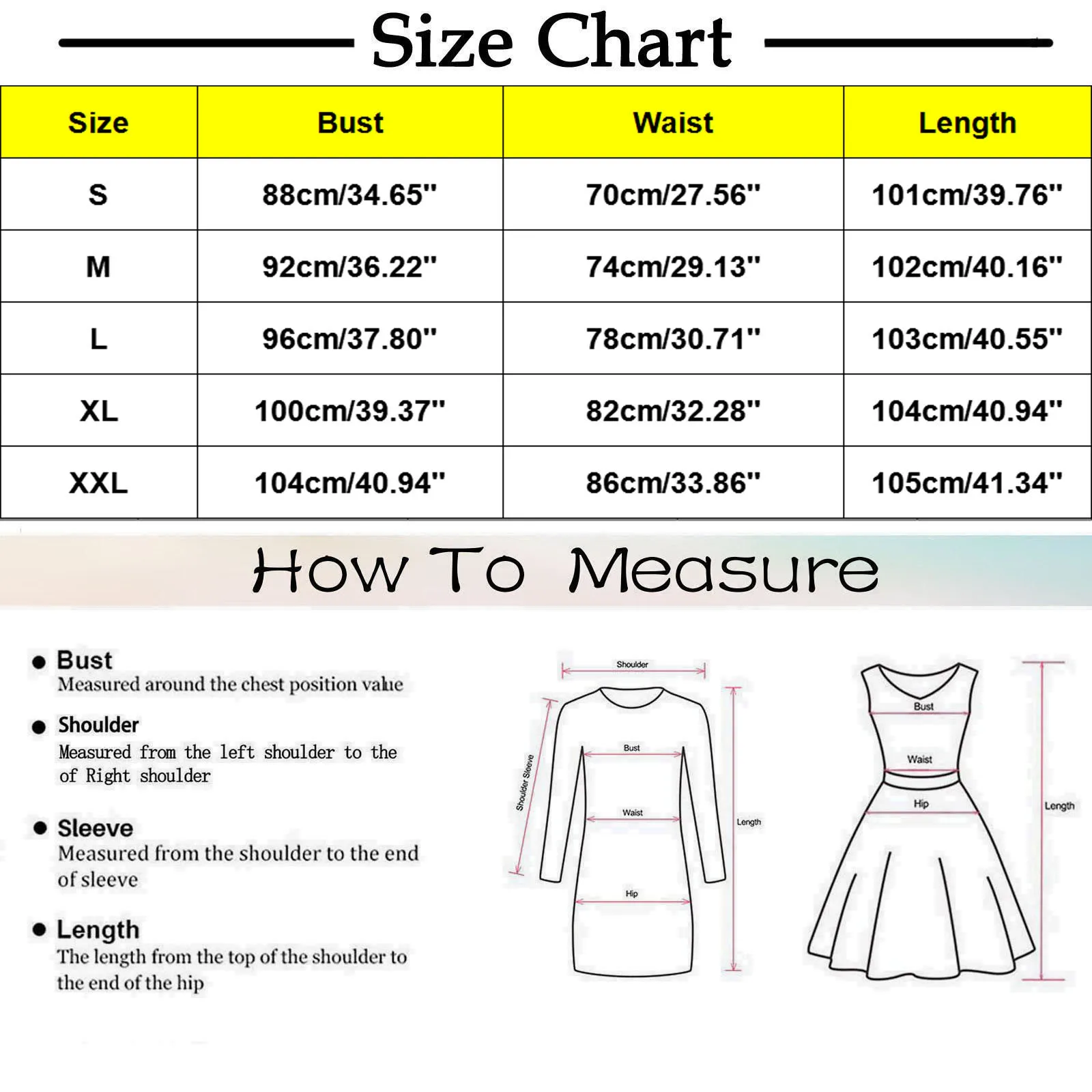 | Size:S | Bust:88cm/34.65'' | Waist:70cm/27.56'' | Length:101cm/39.76'' |