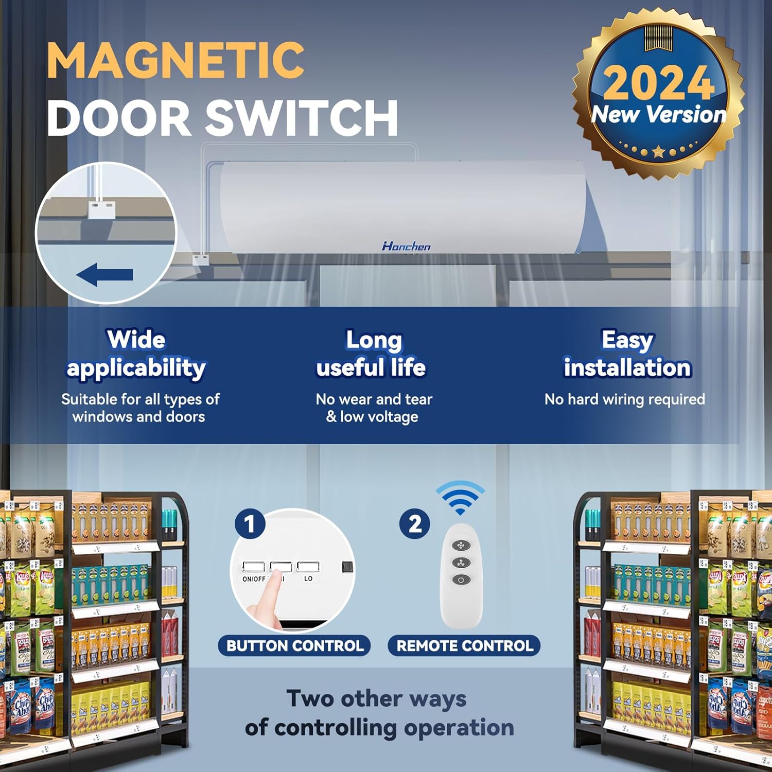 • Super Easy Installation and Connection: 1) Mount the mounting plate. 2) Hang the air curtain up. 3) Fix the upper and lower door magnetic controller to the door frame with glue or a screwdriver. Unlike traditional plunger switches, our magnetic door switches do not require hard wiring! Also detailed diagrams for installation in the instruction manual for your reference!