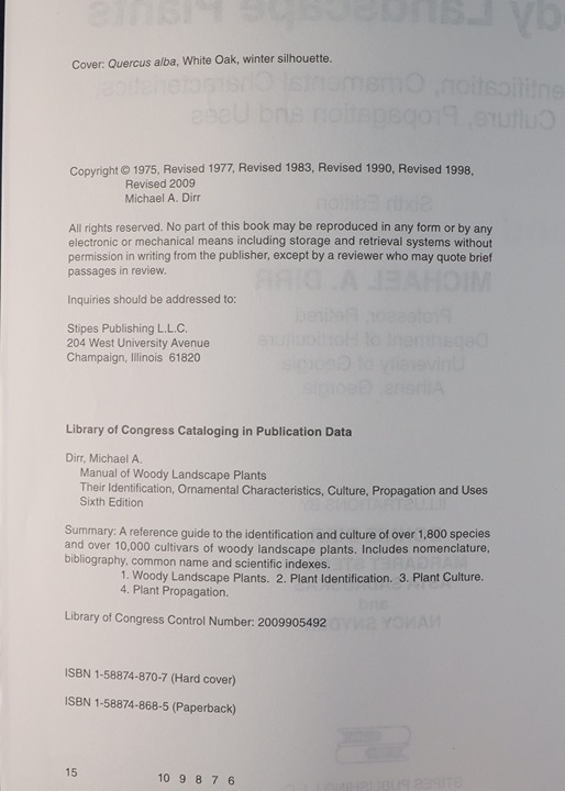 Good condition. Rise in Cover Edge. 1325 Pages. thru Stipes Publishing LLC. 8.5x11x3 inches. ISBN 1588748685 Synopsis "Their Identification, Ornamental Characteristics, Culture, Propogation and Uses. It’s a comprehensive reference guide widely used in horticulture and landscape design.