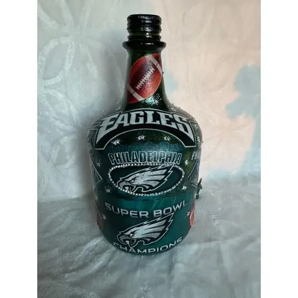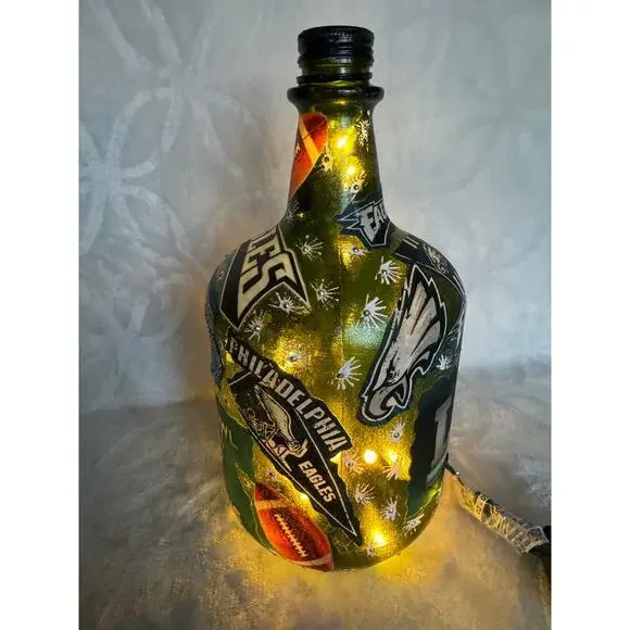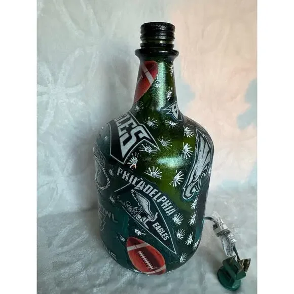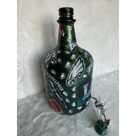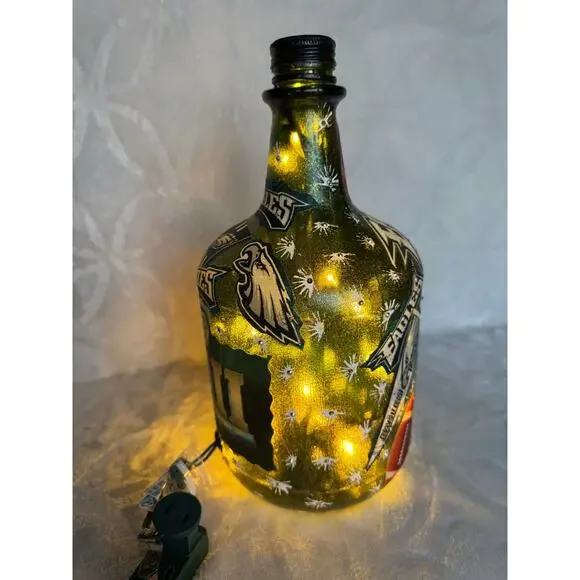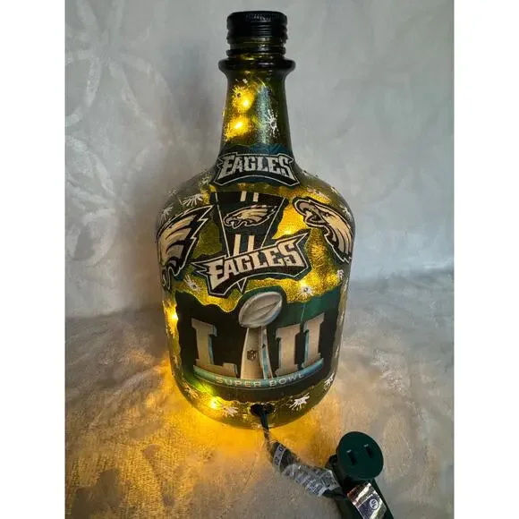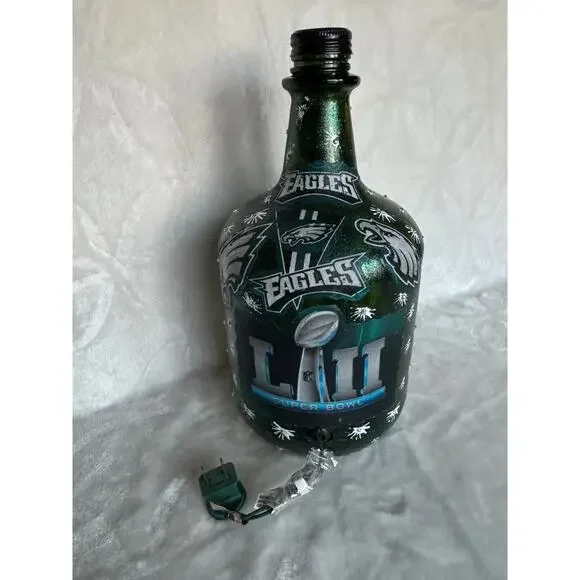 Philadelphia Eagles Glass Gallon Jug with lights "Superbowl"Here is a unique and hard to find quality Handcrafted decorative wine bottle, customized color, design, with 110v plug-in 10-lights, with a 12 inch cord. Great for the kitchen counter, night stand, or entryway table. Beautiful hand decorated bottle inspired by your favorite sports team ..printed to fabric, hand painted and decorated with large or small gemstones .. it is a bottle that serves as a decoration or night light .. We have several bottle shapes and designs with or without gemstones in matchingcolors .. each bottle is a unique perfect gift or spoil yourself, great for any occasion. Complete yourman-cave Or she-shed with this great gift. Thanks for your patronage.If you want a fast shipping send me a message before your purchase I can change the shipping option .. "priority mail usps or ups .. ismore expensive but it is faster..