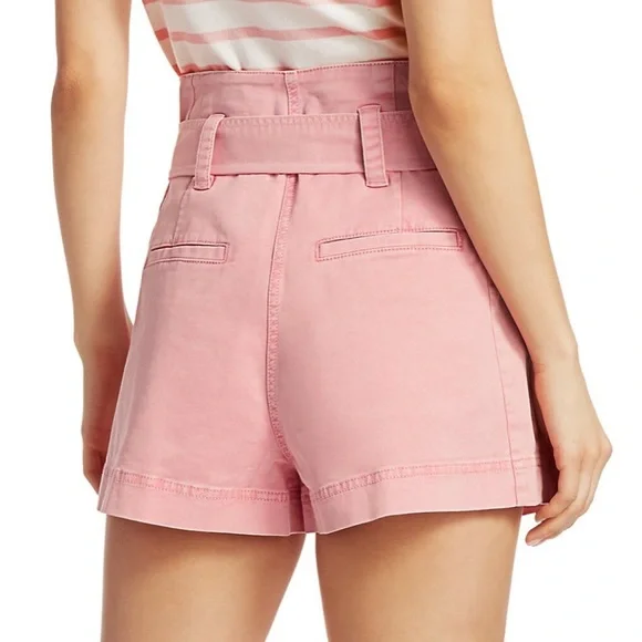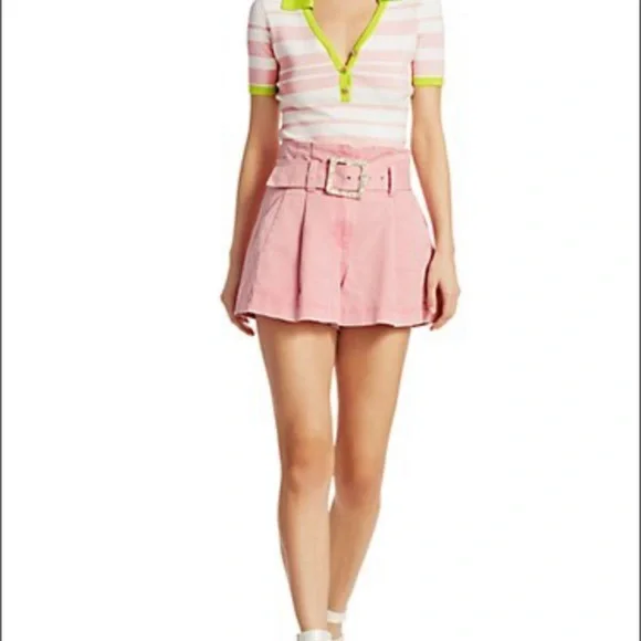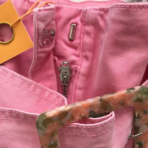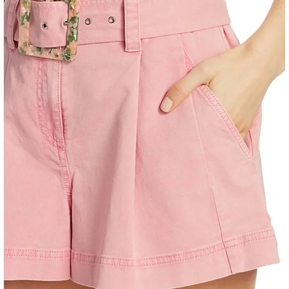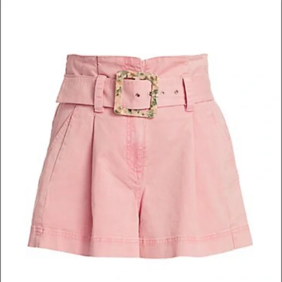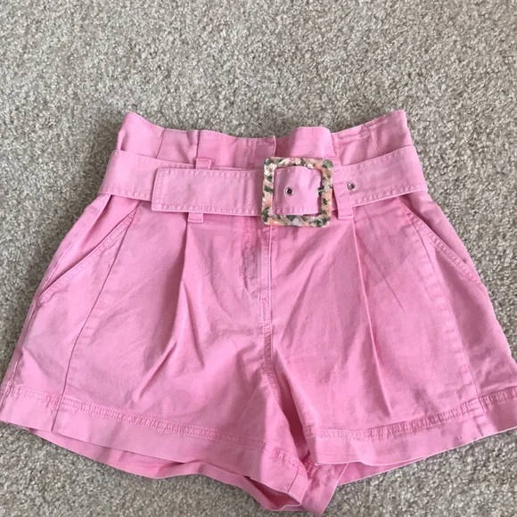 High-waisted shorts with square buckle belt and a flattering flared fit. Has a small faded mark on the front which is not much visible but the last picture shows it. Has a denim material feel to it. Belt loopsBuckle beltZipper flyAngled front pocketsBack welt pocketsCotton/spandexDry cleanSize 2Smoke & pet free home