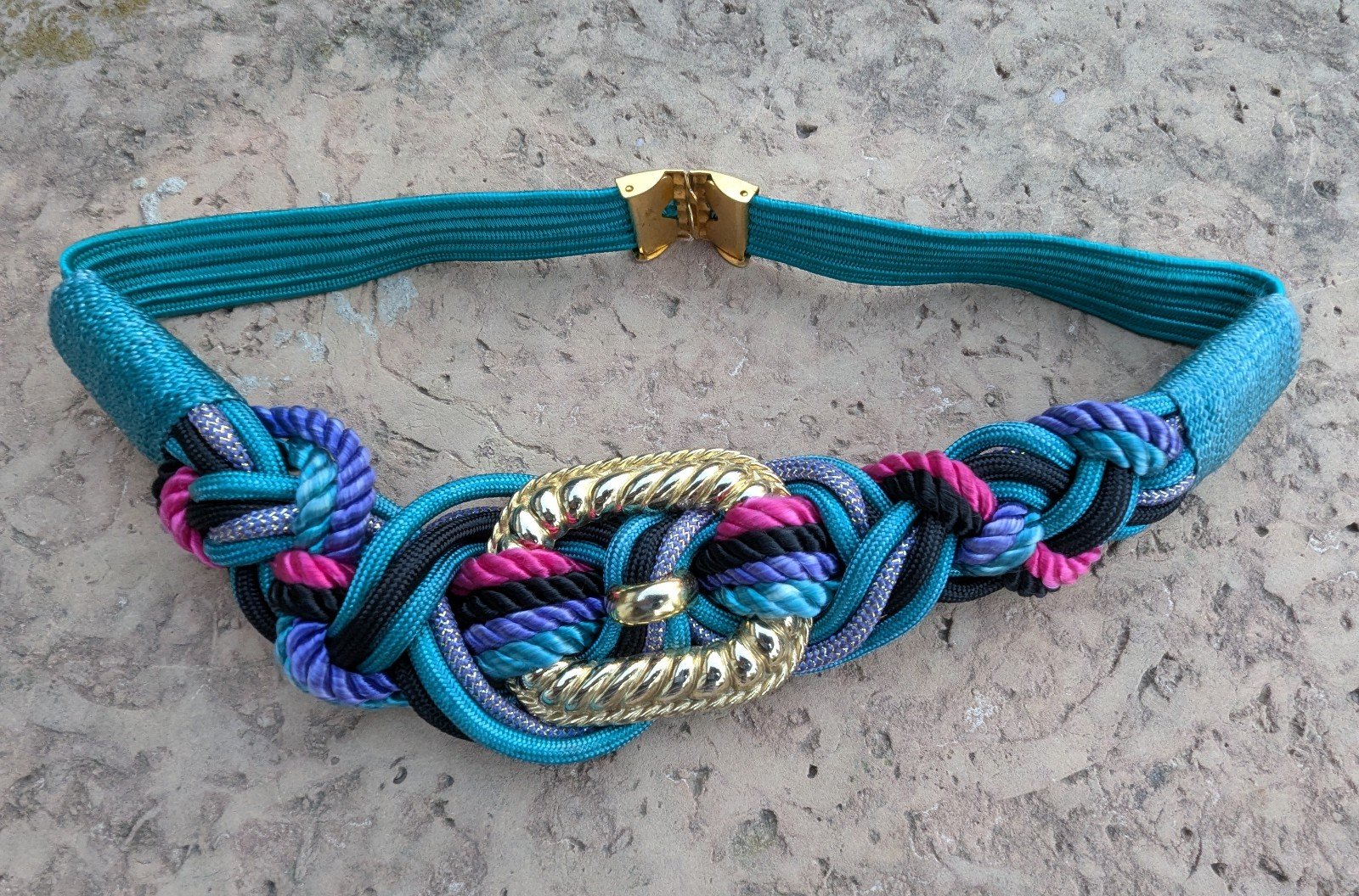 This vintage 80s/90s retro purple teal pink Braided Woven Rope Stretch Belt in size S is a statement piece for women looking to add a colorful and unique accessory to their wardrobe. Made from woven rope material with brass hardware, this belt features a textured pattern and a medium belt width. It is designed with a stretch feature for added comfort and a vintage 80s retro theme that will stand out in any outfit. The belt is a perfect blend of art, ethnic, and novelty style that is perfect for those who appreciate retro fashion from the 80s and 90s.