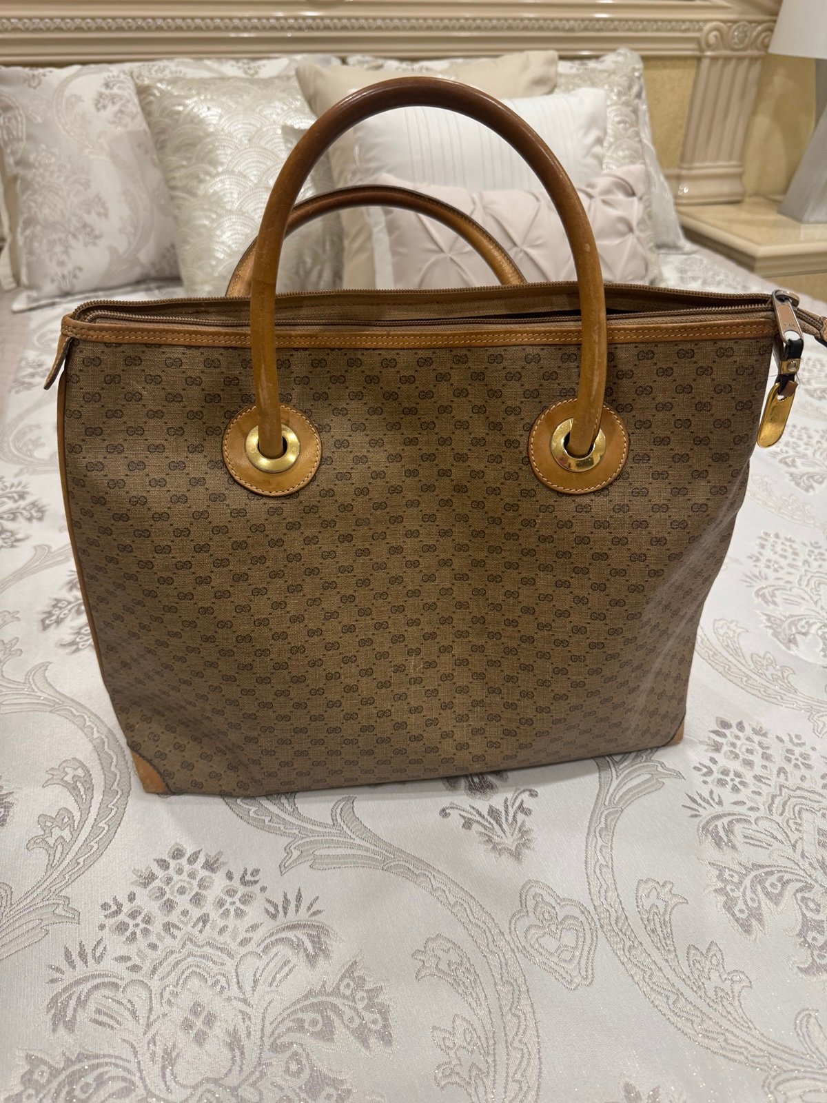 Add a touch of classic luxury to your collection with this authentic vintage Gucci tote bag. Crafted with the iconic GG monogram canvas and accented by rich leather handles and gold-tone grommet detailing, this piece perfectly blends elegance and everyday functionality.